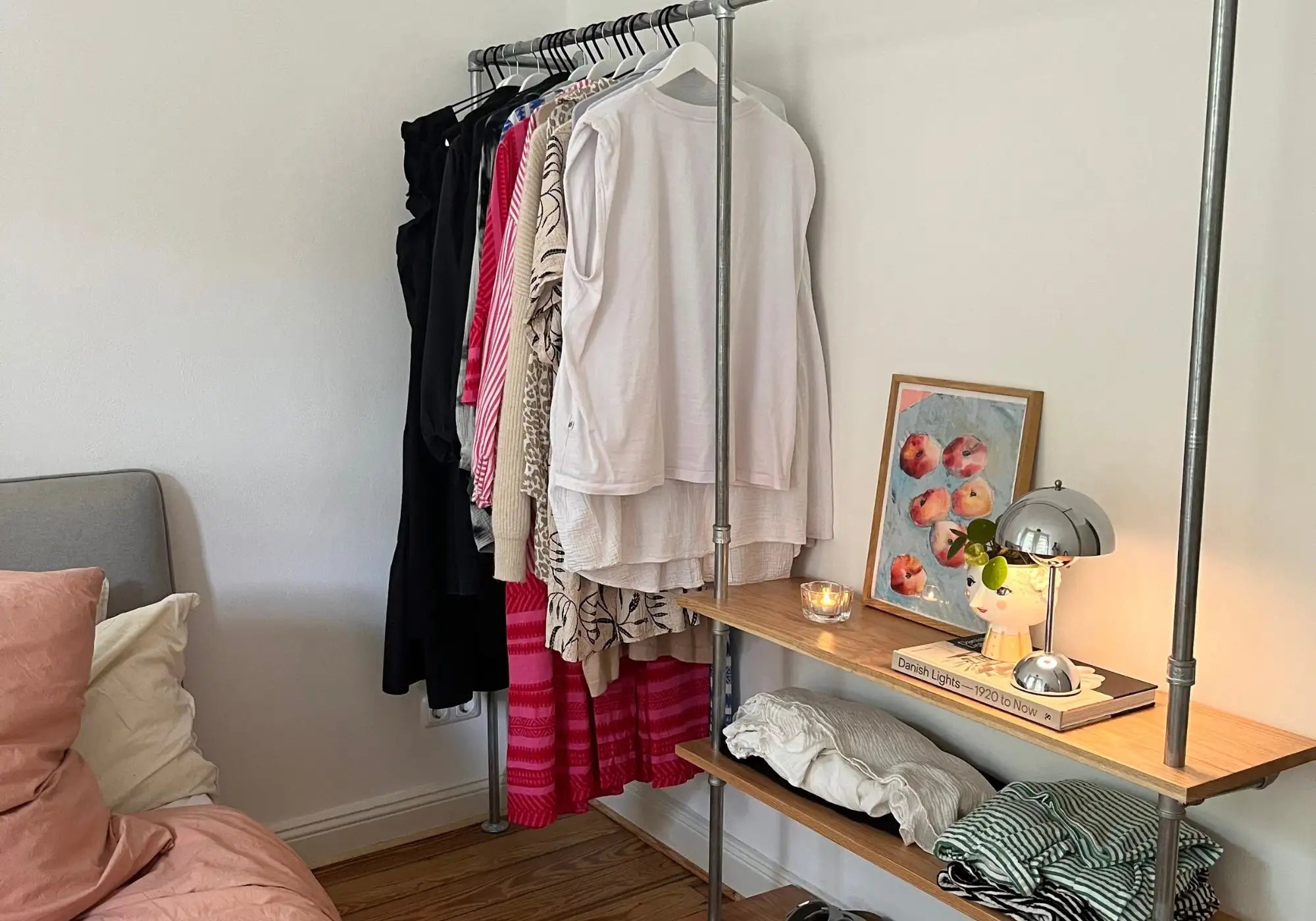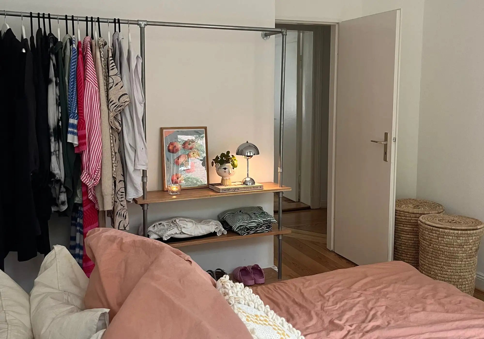 Was ein Industrial Schlafzimmer besonders macht, ist die Balance zwischen rohem Charme und Gemütlichkeit. Kombiniere Möbel wie die unsere Kleiderstange Elias III mit soften Textilien, hellen Farben (wie hier das rosafarbene Leinenbettzeug) und vielleicht einem Vintage-Teppich – und du bekommst einen Look, der edgy und chill zugleich ist.