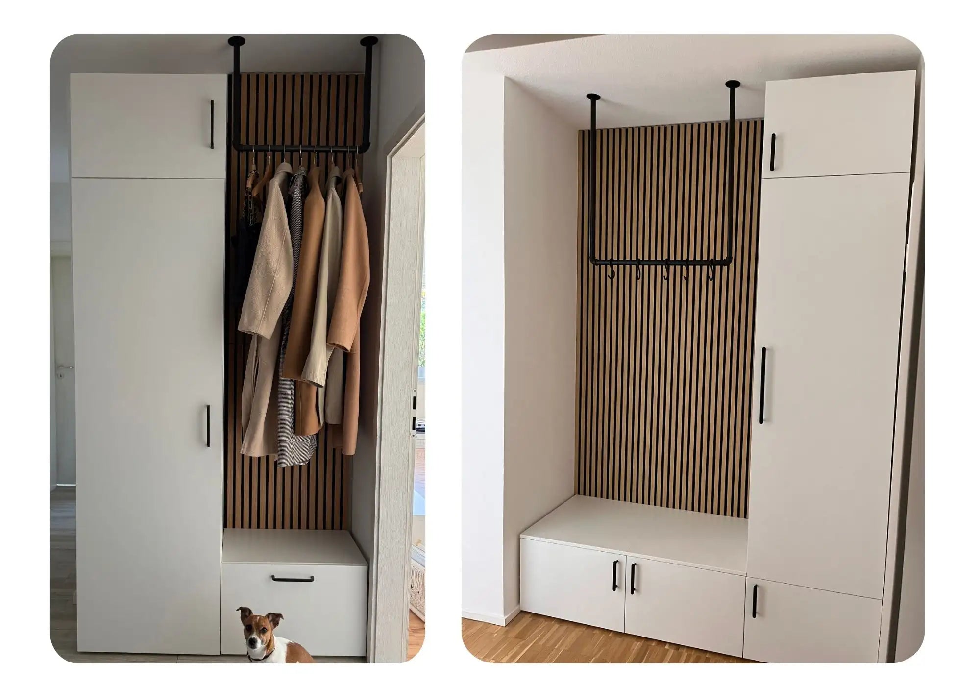 Der Schlüssel liegt im Mix aus Materialien: Schwarze Industrial-Kleiderstangen wirken stark und edgy, während ein weißer Schrank für Minimalismus sorgt und Holzpaneele Wärme in den Raum bringen. So entsteht ein moderner Flur, der stylisch und gleichzeitig funktional ist