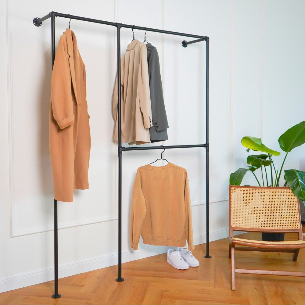 ERICH bietet Dir eine hohe Stabilität durch die Wandbefestigung. Zusätzliche Aufhängmöglichkeiten für Schals oder Gürtel an der Wandbefestigung. Perfekt kombinierbar mit unseren S-Hooks oder Kleiderbügel. Alternativ lassen sich auch kleine Kommoden oder Schuhregale auf dem Boden zwischen den Stangen platzieren. Durch die unterschiedlichen Parteien lässt sich Kleidung verschiedenster Länge verstauen.
